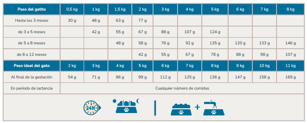 Cantidad RecomendadaSirve la comida poco a poco, haciendo una transición con la comida anterior, tal cual o con agua, según la tabla de racionamiento impresa en la bolsa. Las cantidades diarias deben ajustarse en función de la raza, el peso y la actividad del animal. Deja agua fresca a disposición del animal.